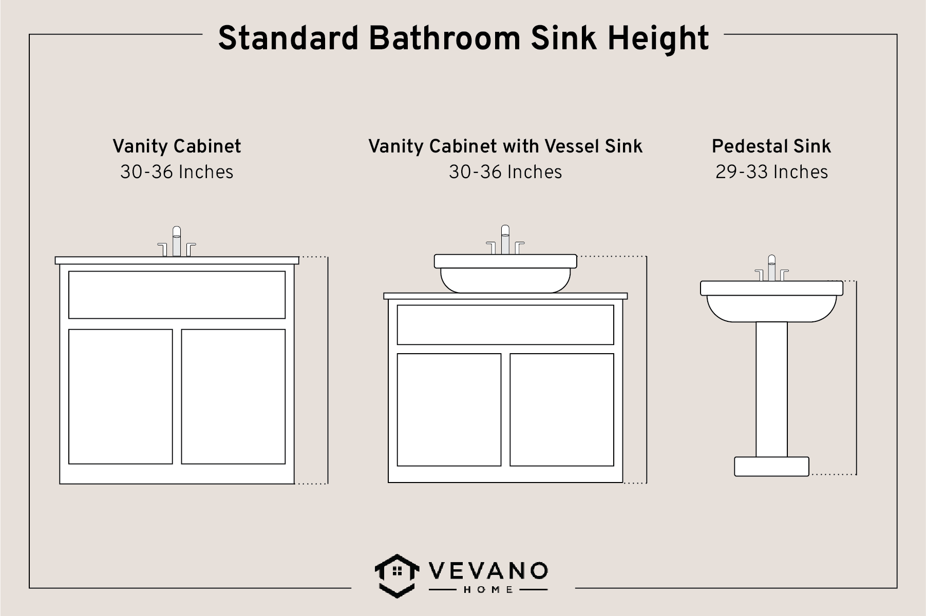 Bathroom Sink Vanity Depth Variations exist, with depths spanning from 20 to 23. Variations exist, with depths spanning from 20 to 23. the standard bathroom vanity depth is 21 inches, according to the national kitchen & bath association. on average, a bathroom vanity will sit at about 30 to 34 inches in height, though homeowners can find comfort. typically, the standard depth of a bathroom vanity is 21 inches. the vessel sink vanity dimensions are calculated similarly to the wall mounted bathroom vanities.
